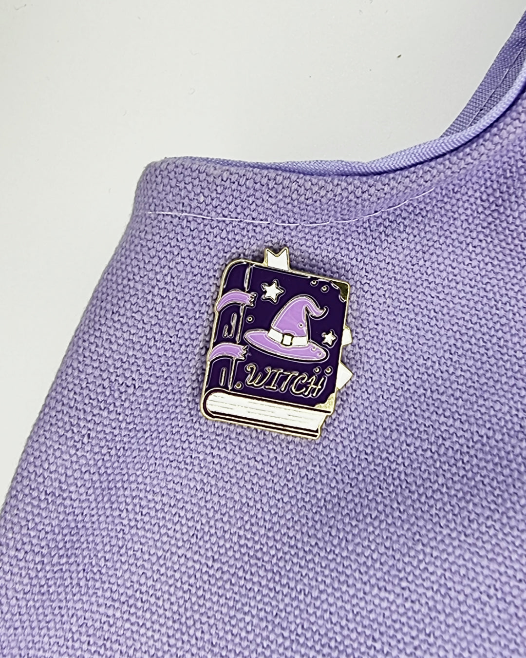 A golden-framed spellbook titled “Witch,” topped with a classic hat icon. Subtle yet magical, this pin adds a touch of mystery to your collection.
