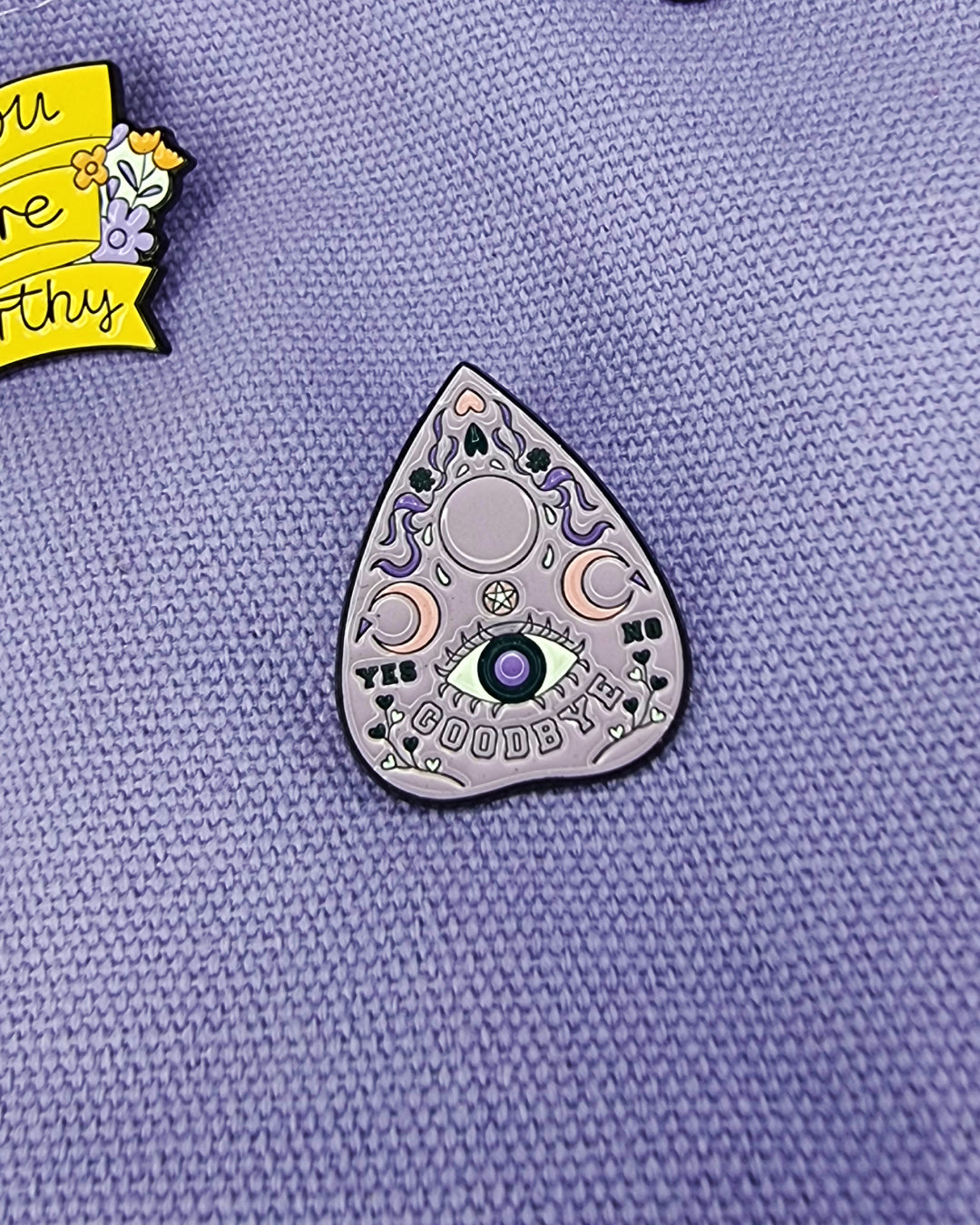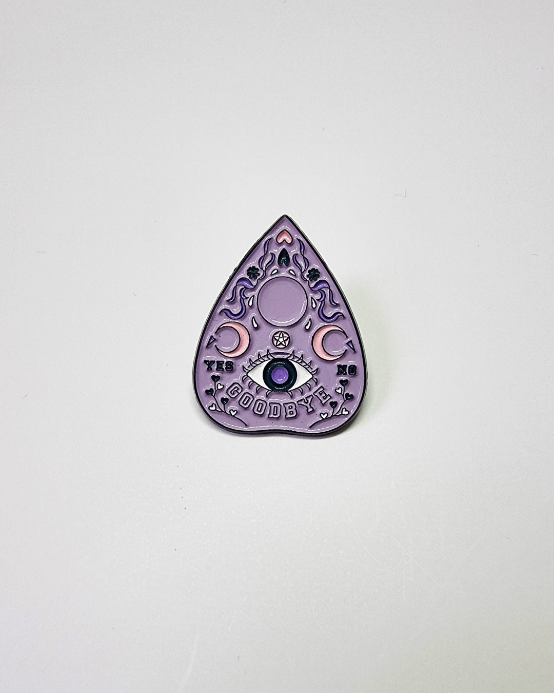 A petal-shaped design with a central eye and the word “goodbye.” Mysterious and striking, this pin makes a subtle statement piece for your collection.