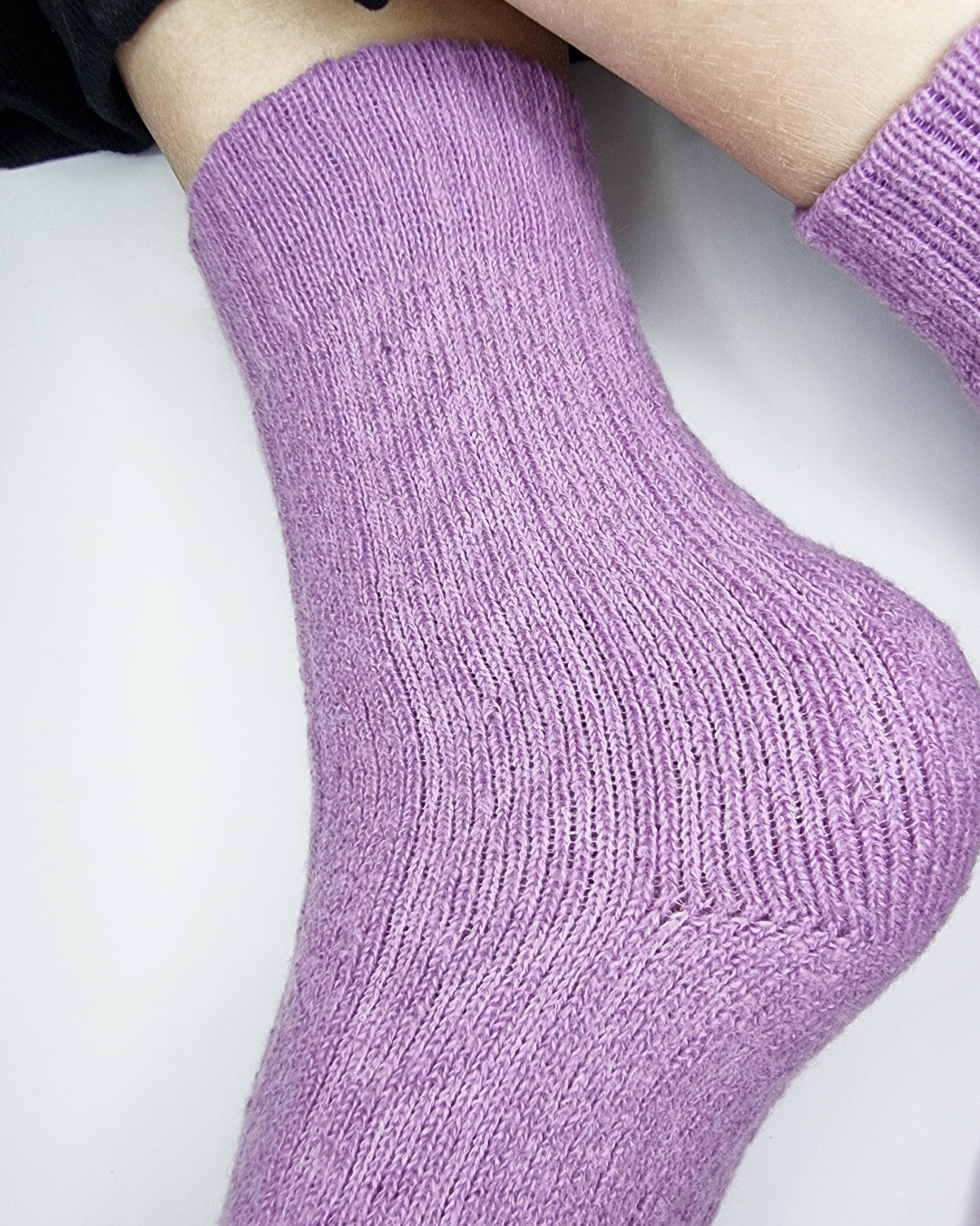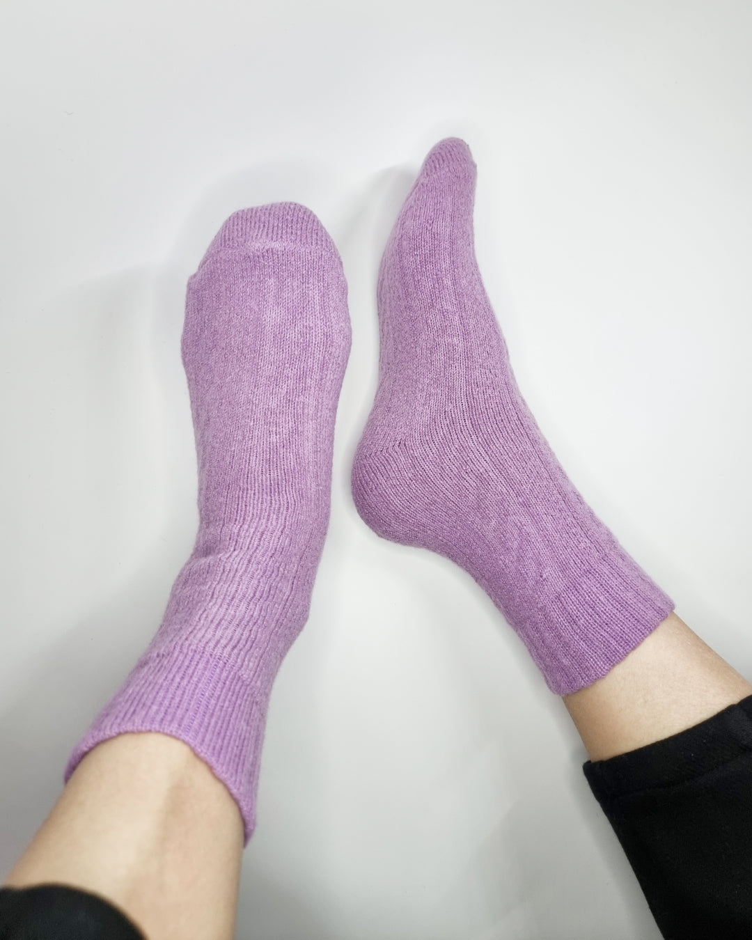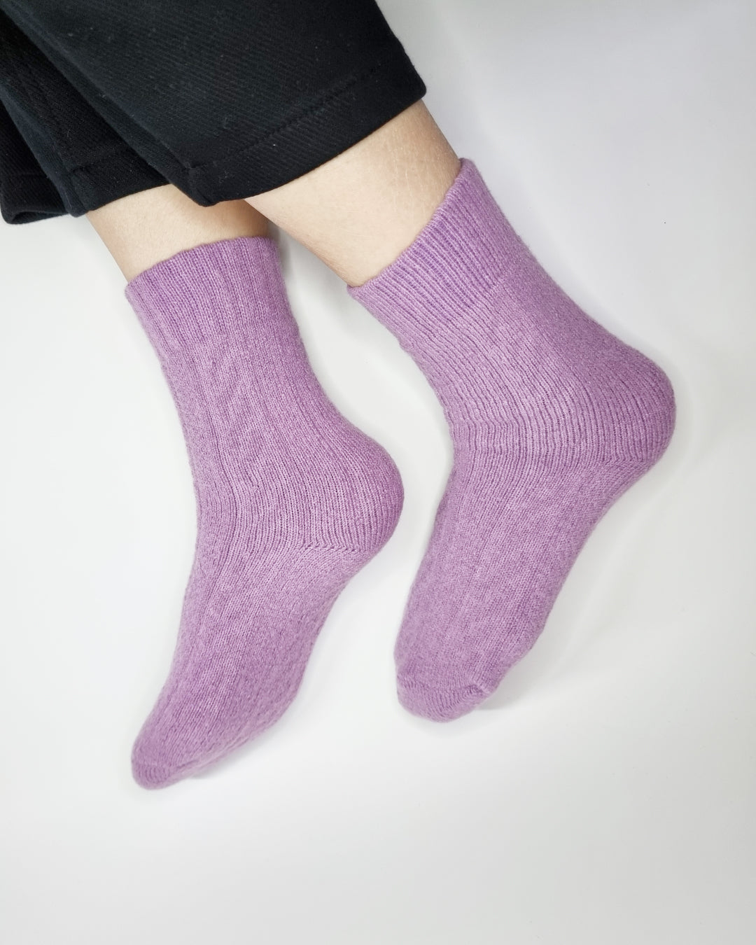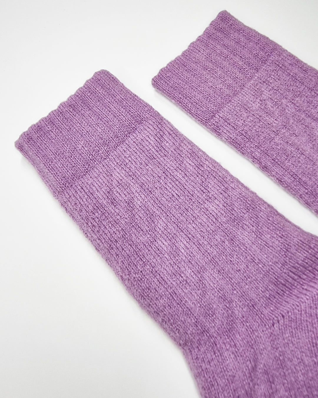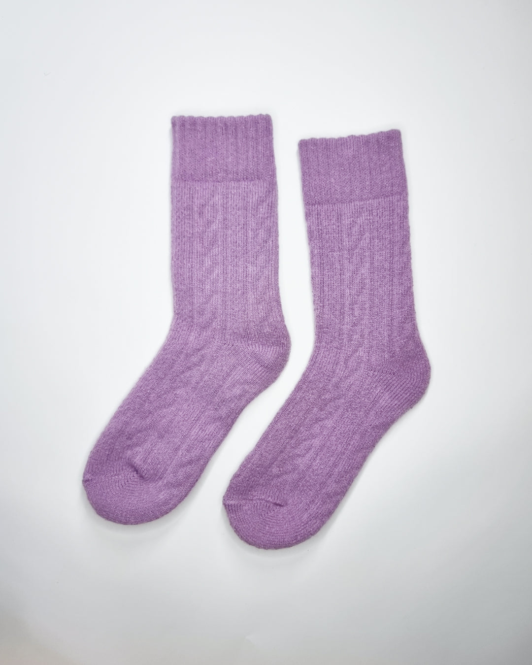 Cable-knit socks in calming purple tones.