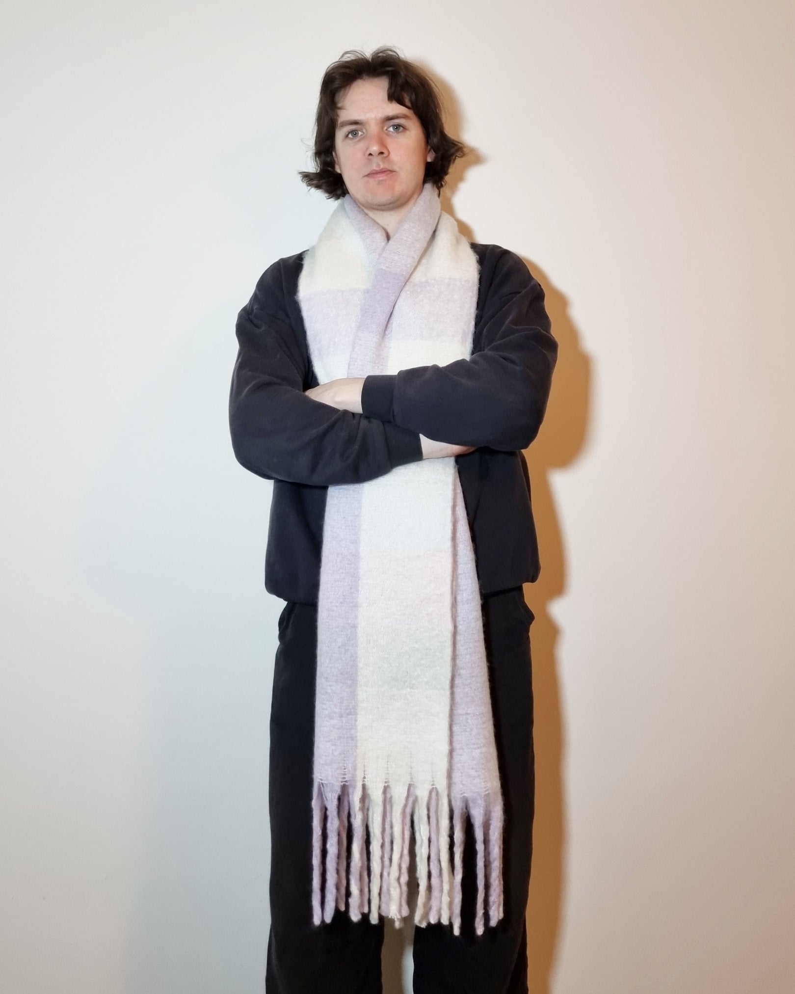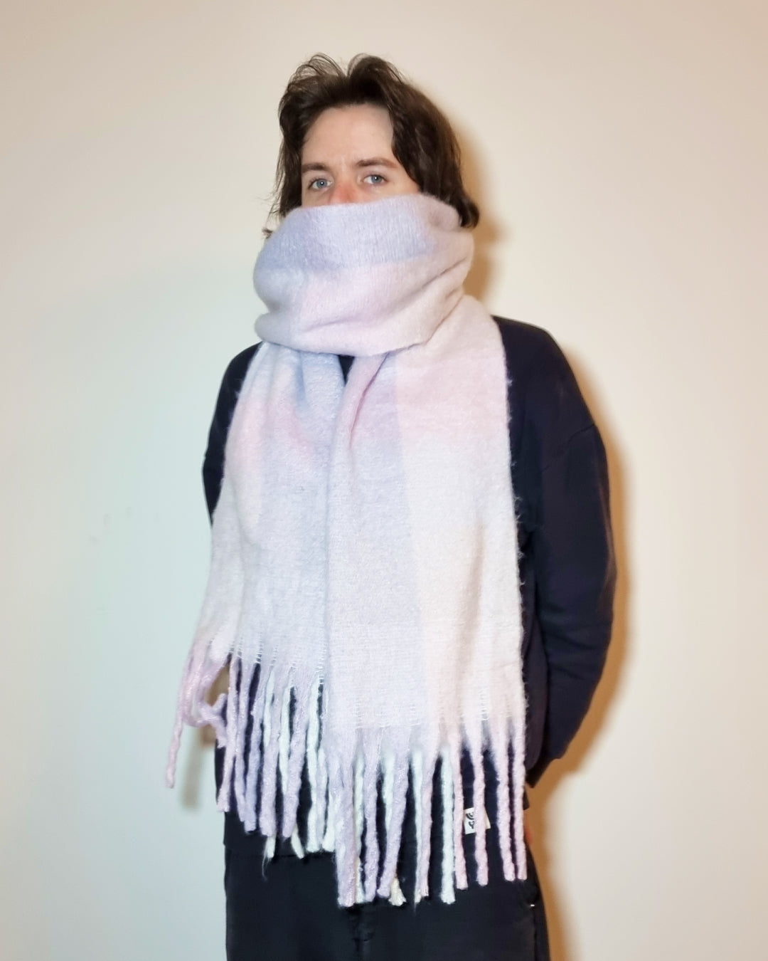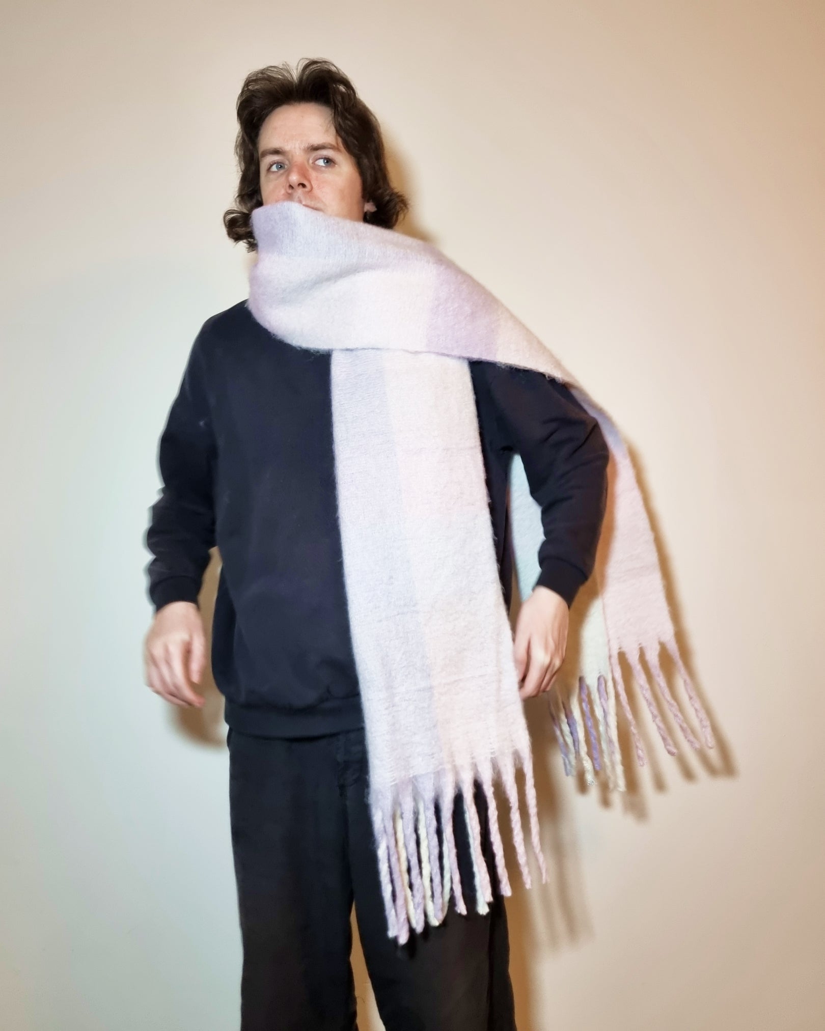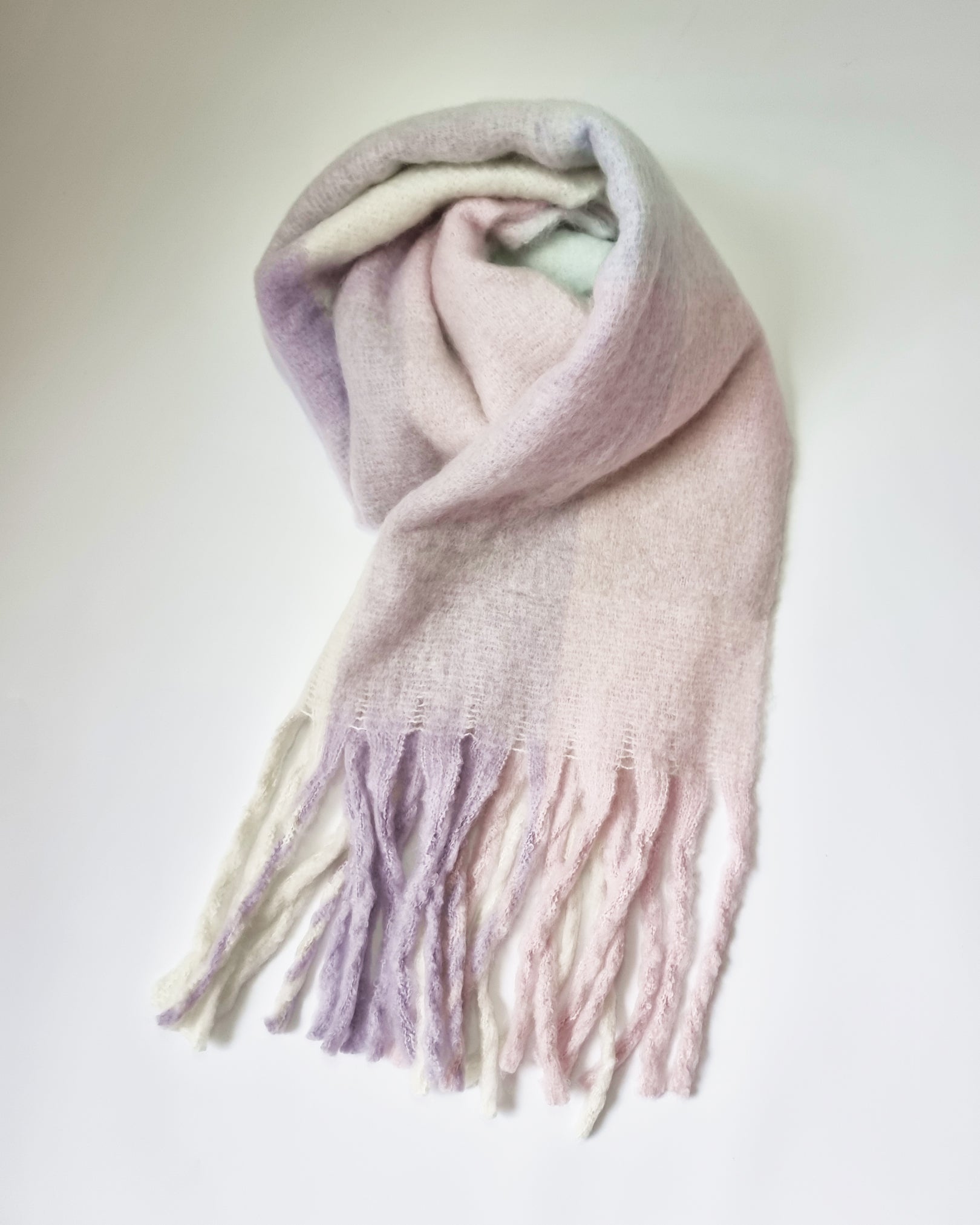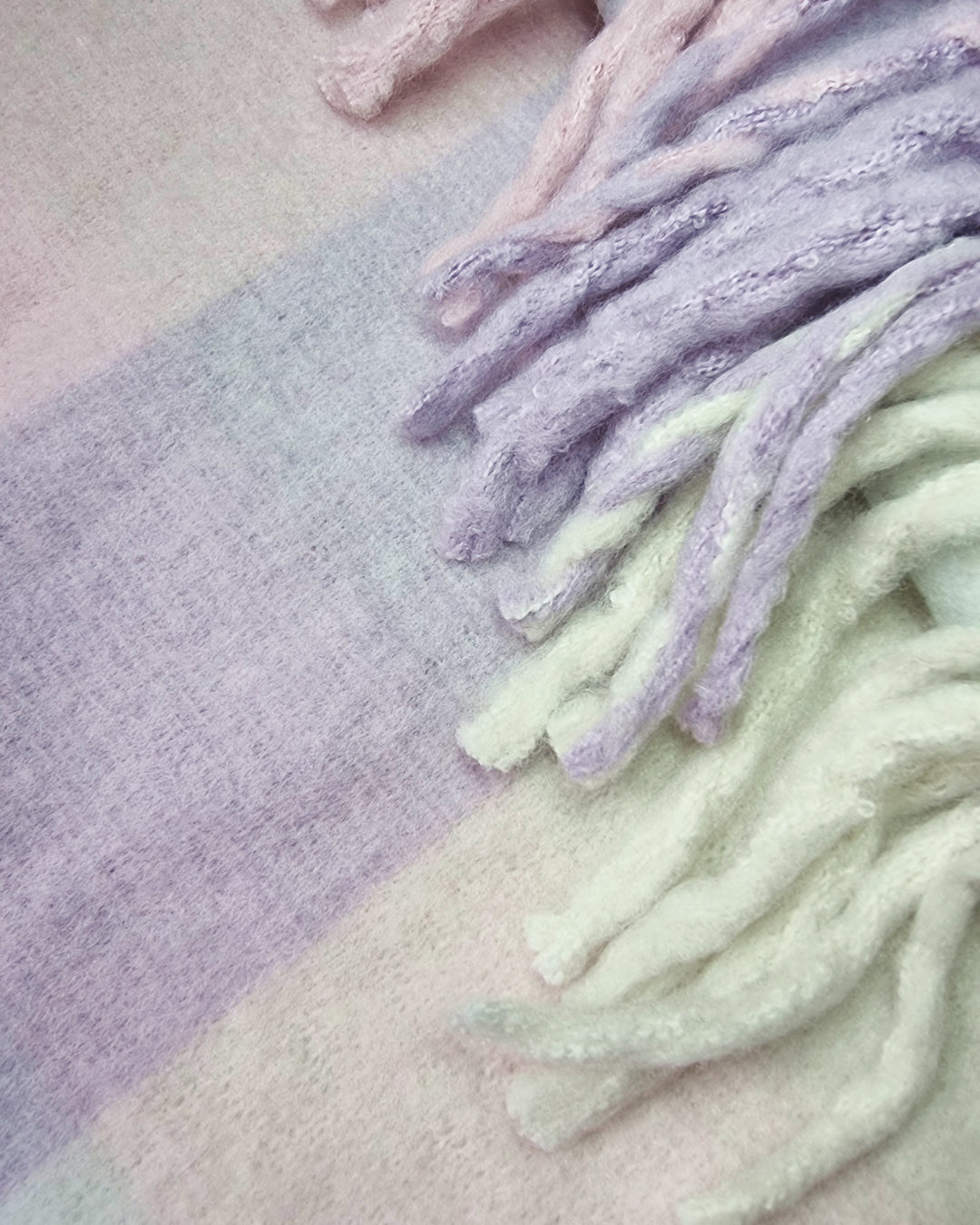 A blend of gentle tones with soft purple leading the way. This scarf offers a calm, layered look that adds subtle depth to your outfit without overpowering it.